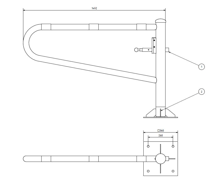 Fastgørelse: Standardmodellen er til udstøbning i beton. Leveres også med fastgørelsesplade ref. 413.01 til indskruning i eksisterende fundament, 360 x 360 x 8mm. 4 huller Ø21mm, centerafstand 260mm.