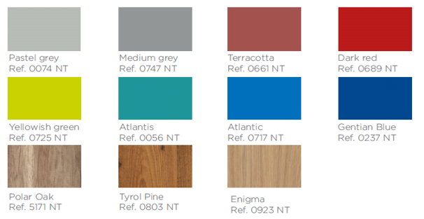 Vedhæftet billede for farvevalg til paneler, farvevalg til tag se separat datablad for RAL-koder.